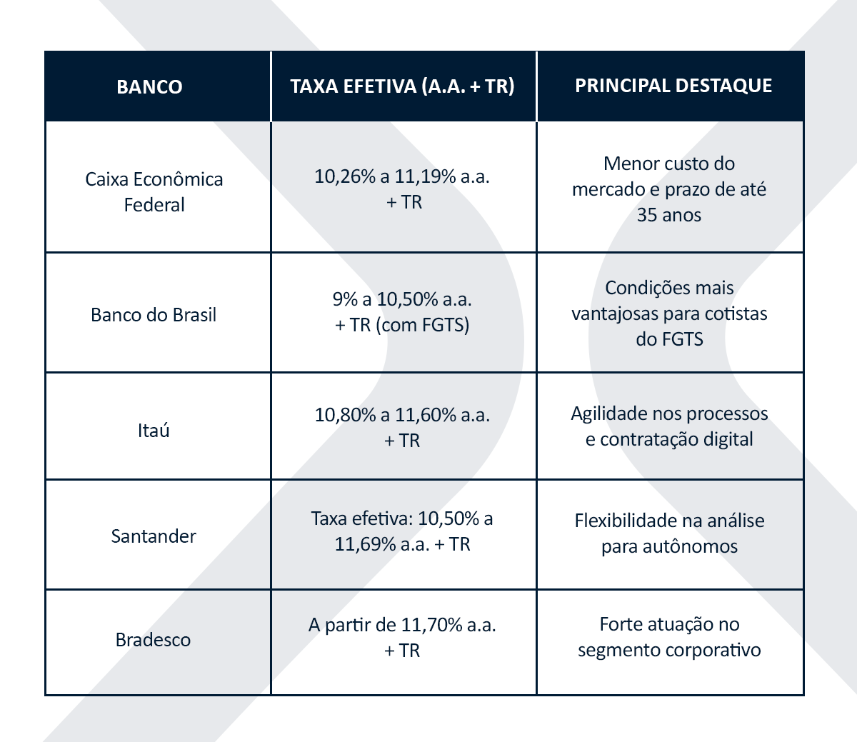 De maneira geral, os bancos públicos costumam oferecer as menores taxas, enquanto os privados se diferenciam pela agilidade e flexibilidade na análise de crédito.